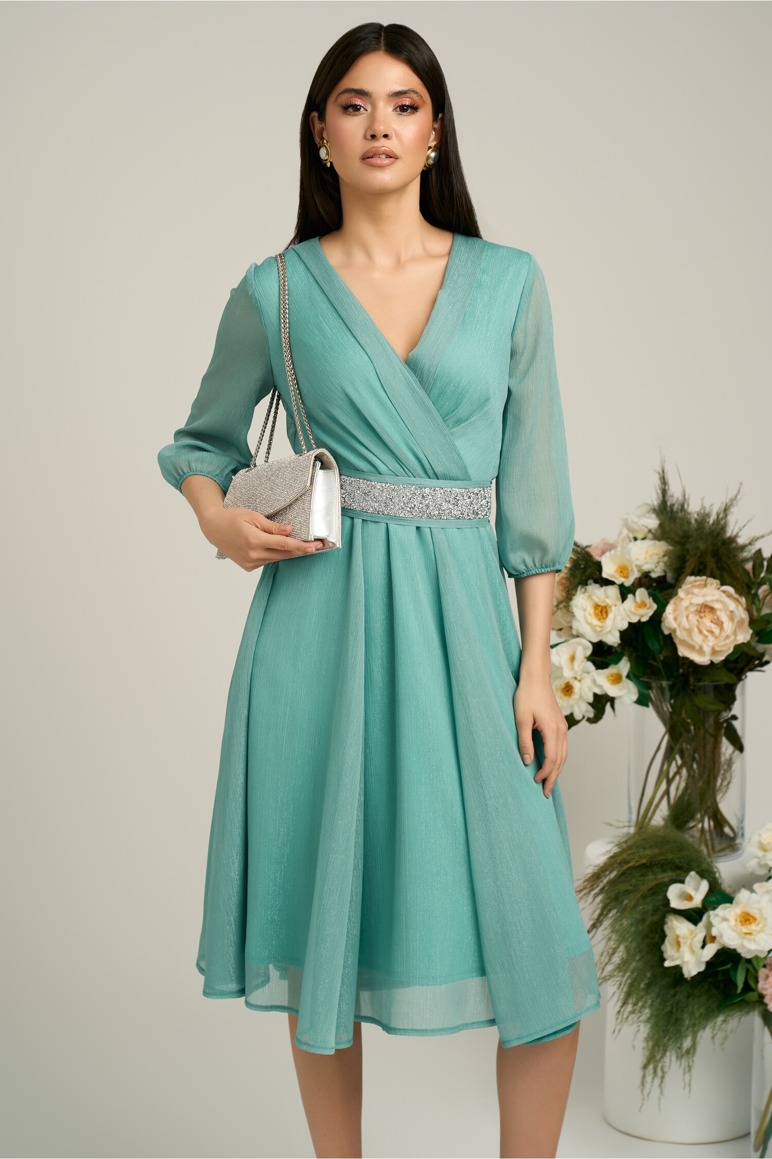 Rochie Dy Fashion verde menta din voal cu fir stralucitor si cordon